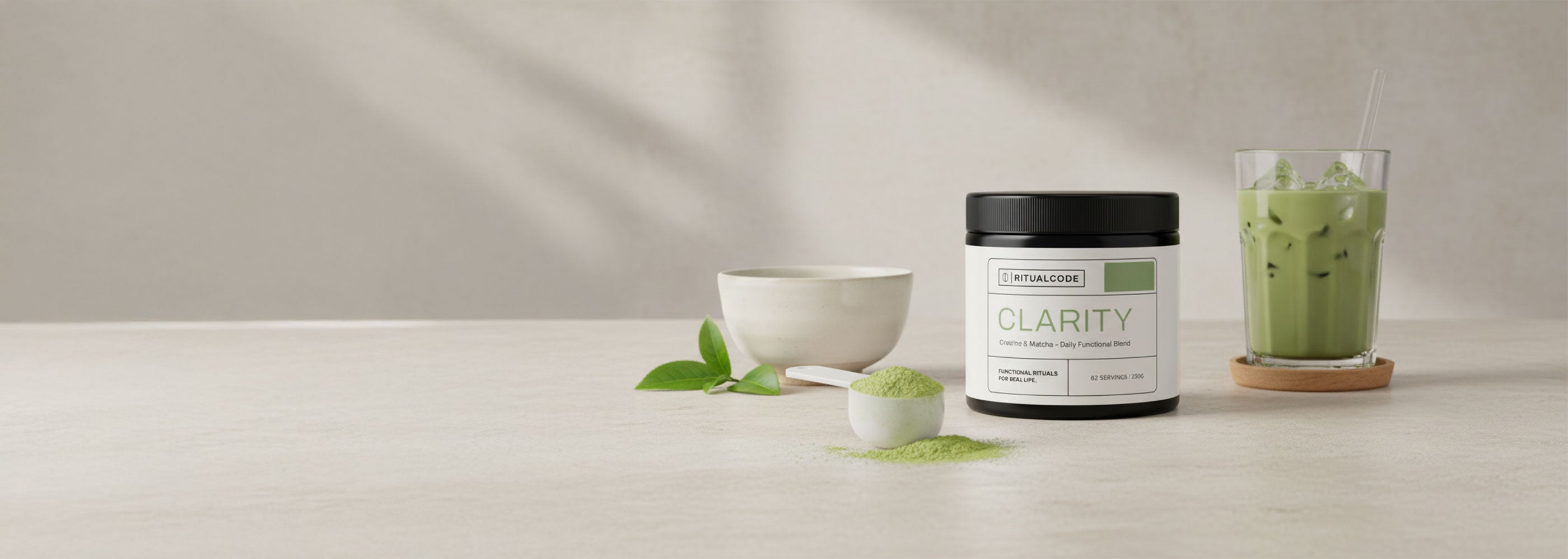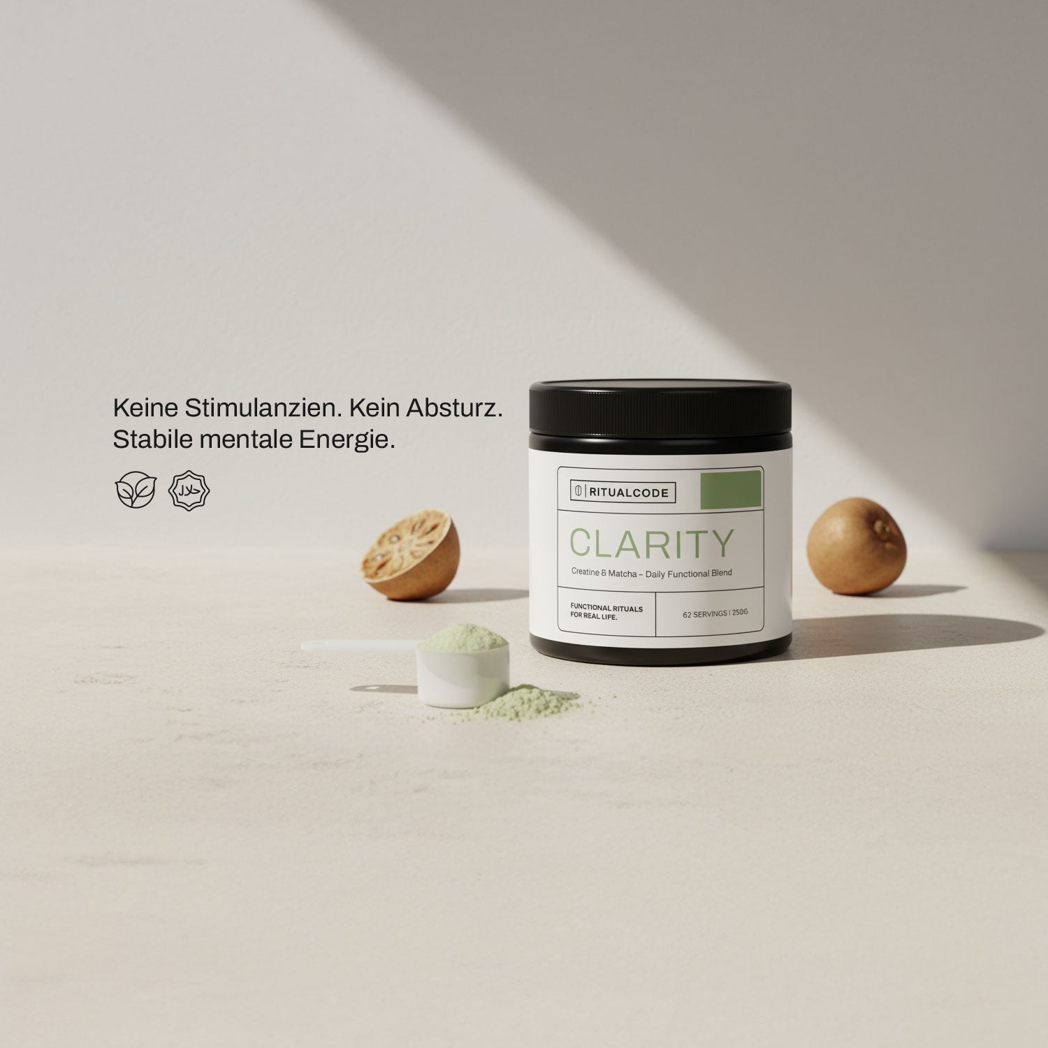 Sanfte Energie aus Matcha trifft auf funktionales Creatin. Ziel ist fokussierter Alltag ohne Nervosität und ohne Absturz.